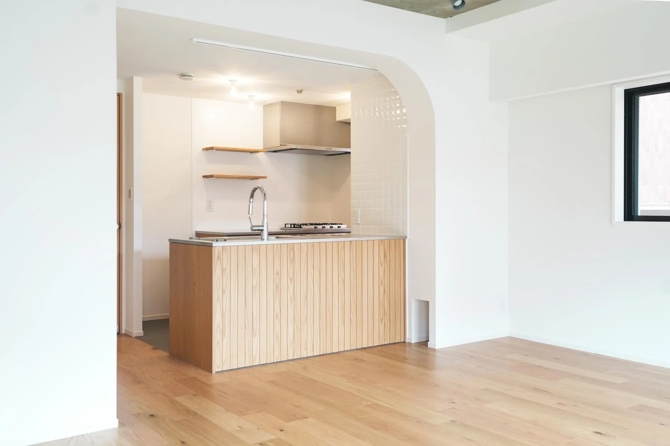 特にキッチンがお部屋の中心になるよう、アーチ開口などを使いながら空間の広がりを感じさせる場所に。