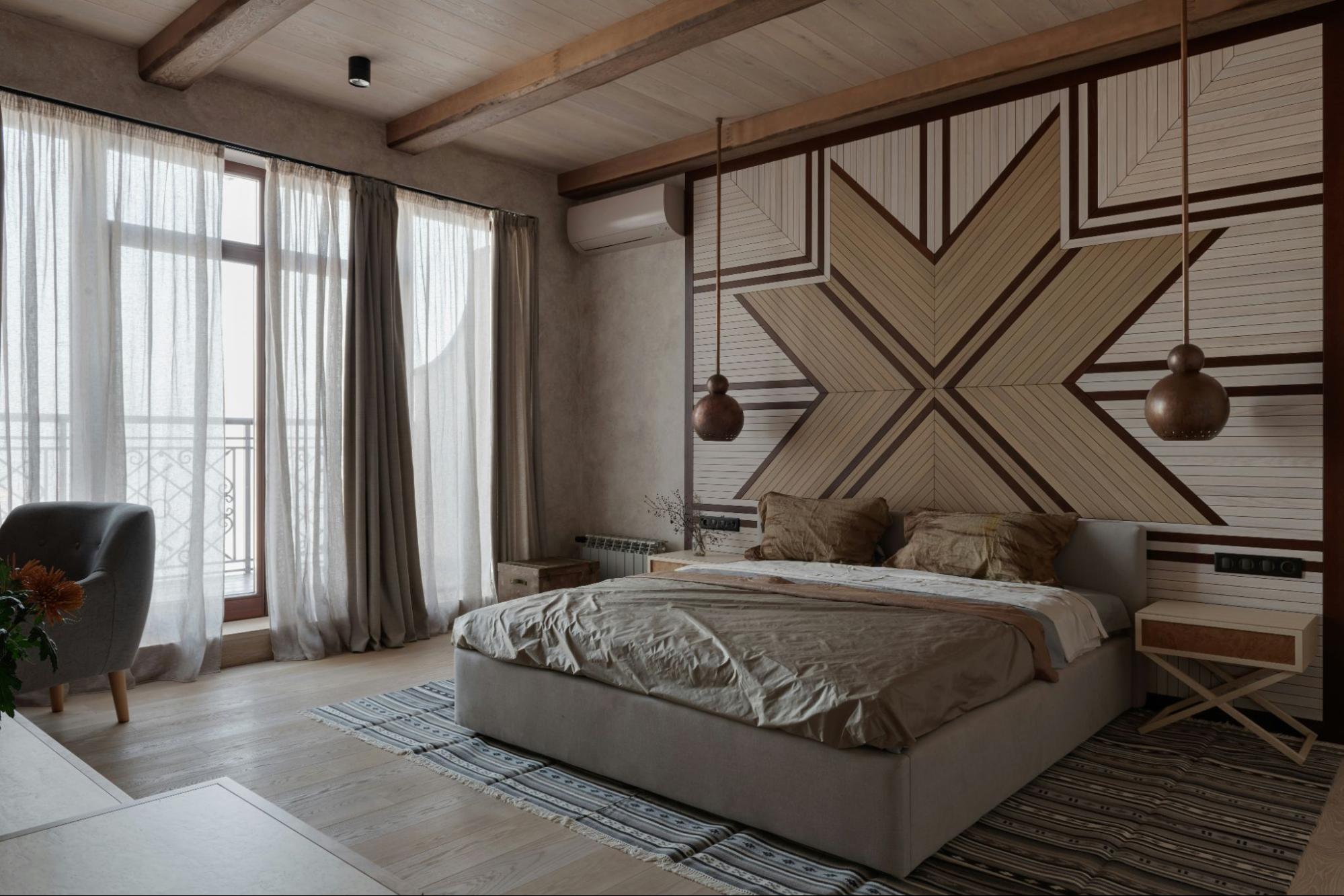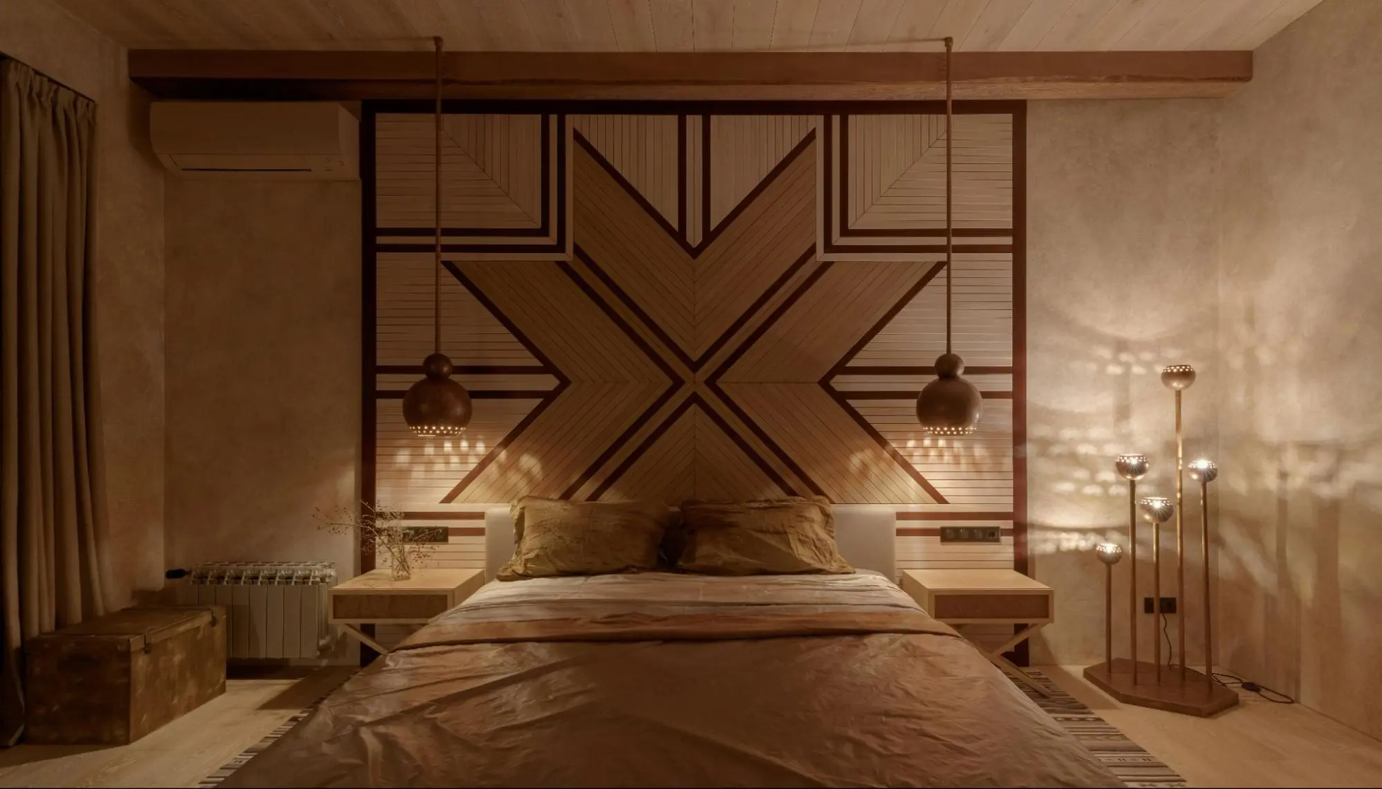 ベッドを中央に据え、サイドの壁付けランプを左右対称(シンメトリー)に配置したレイアウトも、空間の安定感を高める基本を押さえています。