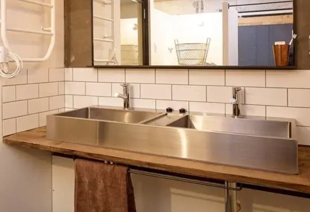 洗面ボウルの下の排水管をあえて金属製にしたり、給水管を壁の外に出して露出させたりすることで、インダストリアル特有のメカニカルな美しさを演出できます。