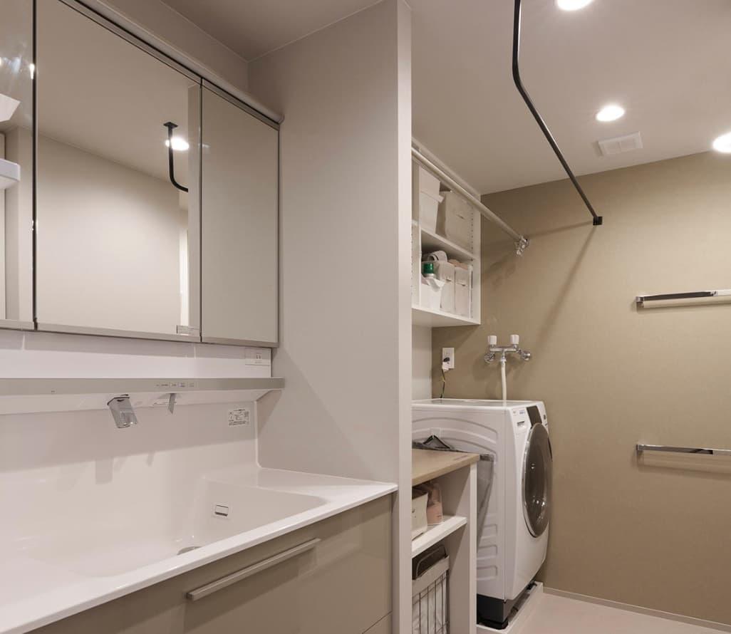 洗面室にはランドリールームと掃除用具収納の機能を持たせ、浴室乾燥で洗濯物が乾いた後、そのまま作業台でアイロンがけや畳み作業ができる設計になっています。