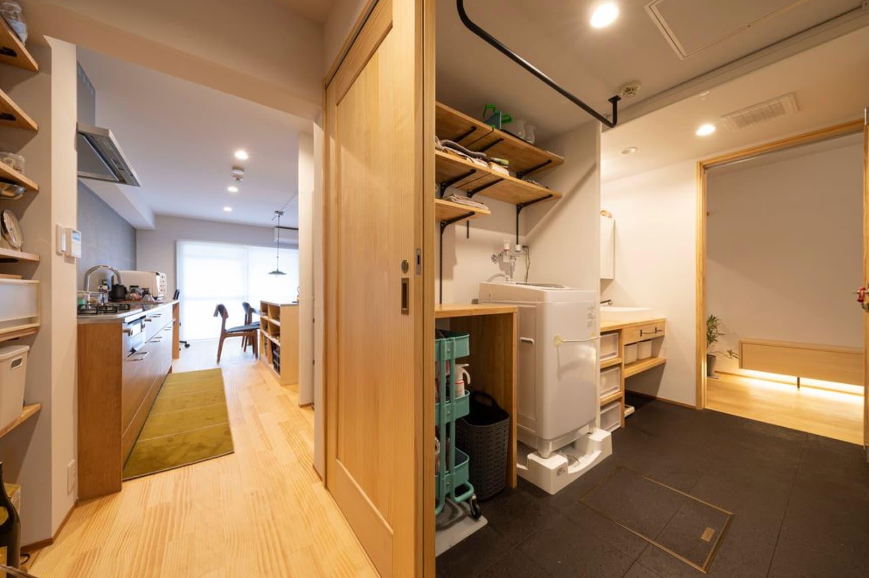キッチンのすぐ裏にランドリールームを配置し、家事動線を短縮したリノベーション事例です。