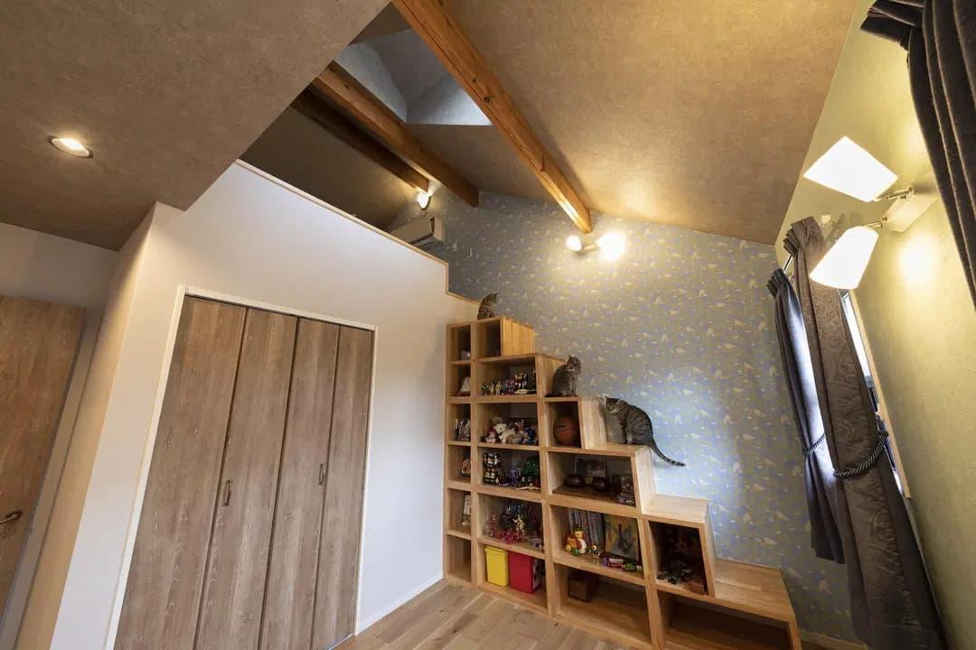 ロフトに登るための階段は、本やおもちゃを置ける棚としても使えるように工夫されています。